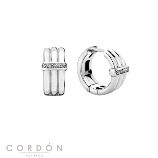 Pendientes de Aros de Cordón Joyeros para mujer de la colección Eternal Circonitas fabricado en plata 925 bañada en rodio, presenta un diseño de unos Aros cuentan con un trío de delicados anillos unidos por una hilera brillante de circonitas blancas. Su cierre es de Clip. La medida es de 13mm.