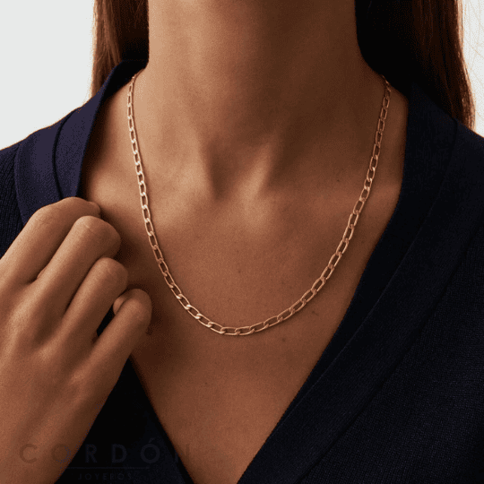 Cadena eslabones rectangulares de 50cm de largo con un alargador. Joya acabada en Oro.