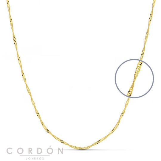 Te presentamos la Cadena De Oro Amarillo 18k Singapur de 45cm de Largo y 1.5mm de Ancho. Descubre toda la colección de cadenas hechas especialmente para ti. Puedes combinarlas con toda la variedad de colgantes que tenemos disponibles.