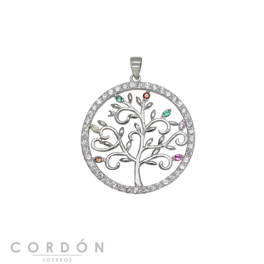 Colgante de Cordón Joyeros para mujer Árbol de la Vida Circonitas Colores, fabricado en plata 925 bañada en rodio. Presenta un diseño de un Árbol de la Vida con Circonitas Multicolor. Su medida es de 28mm.