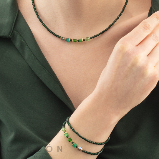 La colección combina una versátil pulsera cruzada que se puede transformar en una elegante gargantilla con un solo movimiento, con un delicado collar. Diseñado en ocho colores radiantes, cada pieza es una expresión de pura alegría de vivir y creatividad. Ya sea como una declaración colorida o un atractivo sutil, la serie le da a cada atuendo un toque individual.