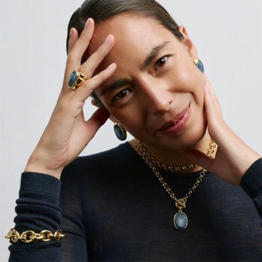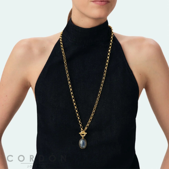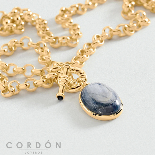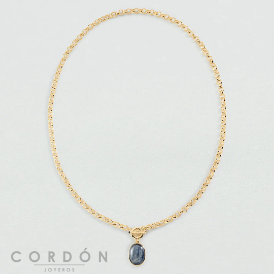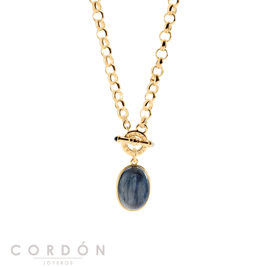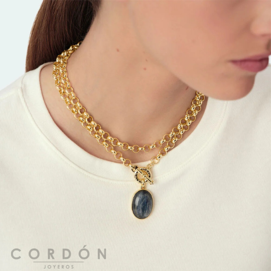 Collar de cadena de eslabones acabado en oro, con cierre delantero tipo bâton y colgante de piedra natural azul. Es una joya con carácter que destaca por su elegancia, ideal para regalar en una ocasión especial.