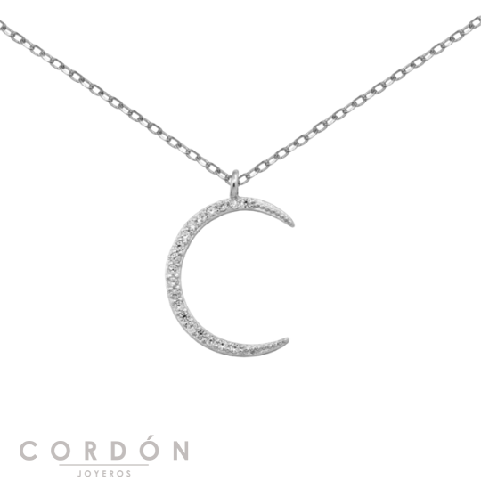 Collar de Cordón Joyeros para mujer Luna con Circonitas, fabricado en plata 925 bañada en rodio, presenta un diseño de una Luna con Circonitas. Su cierre es de mosquetón.
