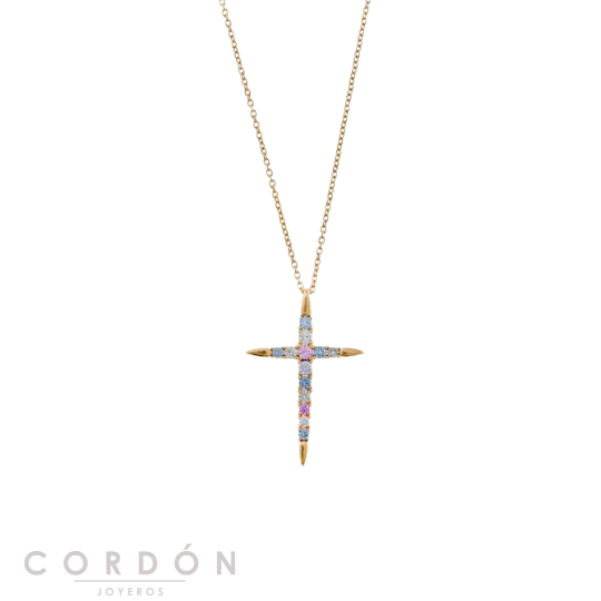 Collar de Salvatore Plata 136C0407 Vibrant para mujer fabricado en plata bañada en Oro compuesta por una fina y elegante cadena chapada en Oro 18K que da lugar a un colgante en forma de cruz con Circonitas Espinel, Verde aqua, Rubí y Lavanda. Su cierre es de mosquetón ajustable.