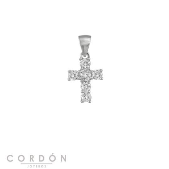 Colgante de Cordón Joyeros Cruz Circonitas, fabricado en plata 925 bañada en rodio. Presenta un diseño de una Cruz con Circonitas Blancas. Su medida es de 11x14mm.
