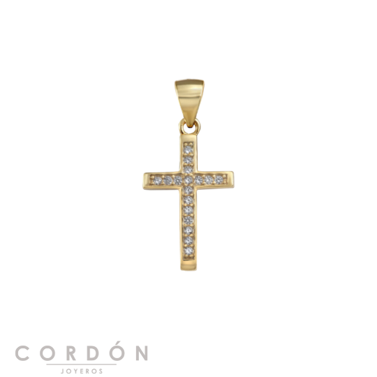 Colgante de Cordón Joyeros Cruz Dorada Circonitas, fabricado en plata 925 bañada en Oro 18K. Presenta un diseño de una Cruz con Circonitas Blancas. Su medida es de 13x19mm.
