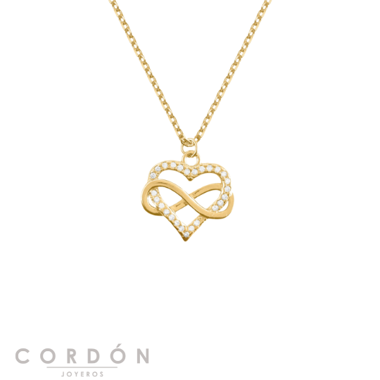 Collar de Cordón Joyeros para mujer de la Colección LOVE Dorado Corazón Infinito Circonitas, fabricado en plata 925 bañada en Oro 18K, presenta un diseño de un Corazón con un Infinito cruzado y con Circonitas. Su cierre es de mosquetón.