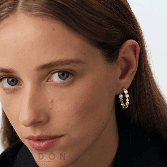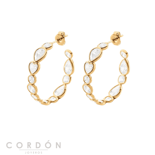 Criollas acabadas en oro con circonitas de diferentes formas. Un diseño original con el que sorprender y divertirte creando lookazos. Favorecen a más no poder y aportan un brillo muy especial a tu día a día.