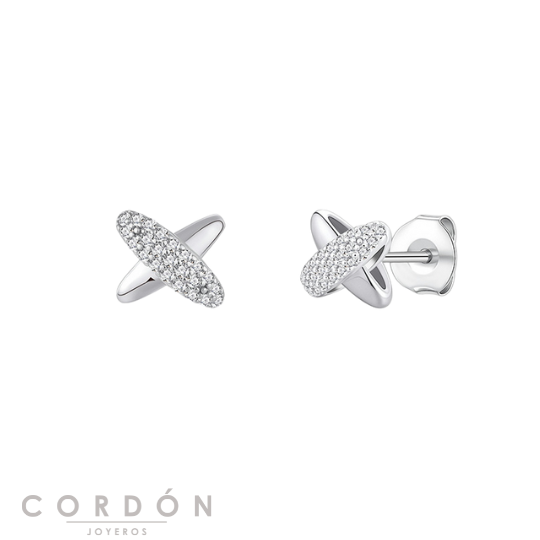 Pendientes de Cordón Joyeros para mujer de la Colección ETERNAL Cruzado Circonitas, fabricado en plata 925 bañada en rodio presenta un delicado diseño cruzado. Dos anillos entrelazados forman la cruz y con Circonitas Blancas. Su cierre es de presión.