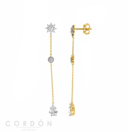 Los Pendientes Plata Chapado Dorado Estrella Polar, Circulo Y Pera Cadena Circonitas Blancas Brillantes Bajo Rodio De La Colección Astral de la casa Salvatore le dará un toque de color que iluminará tu look y tu rostro.