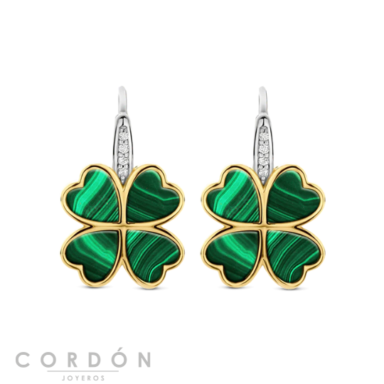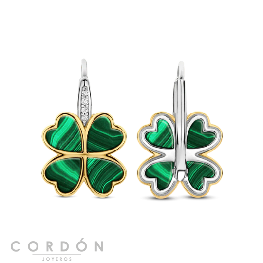 Los pendientes colgantes de trébol chapados en oro TI SENTO 78005MA son un moderno talismán de suerte y estilo sin esfuerzo. Elaboradas en plata de ley 925 de primera calidad, estas elegantes gotas cuentan con un radiante marco de trébol de cuatro hojas chapado en oro amarillo, que abraza llamativas piedras de color verde malaquita. Con su rico aspecto natural, la malaquita evoca una sensación de armonía y belleza atemporal. Suspendidos de elegantes ganchos de palanca chapados en oro, estos pendientes se mueven con gracia, captando la luz con cada paso.