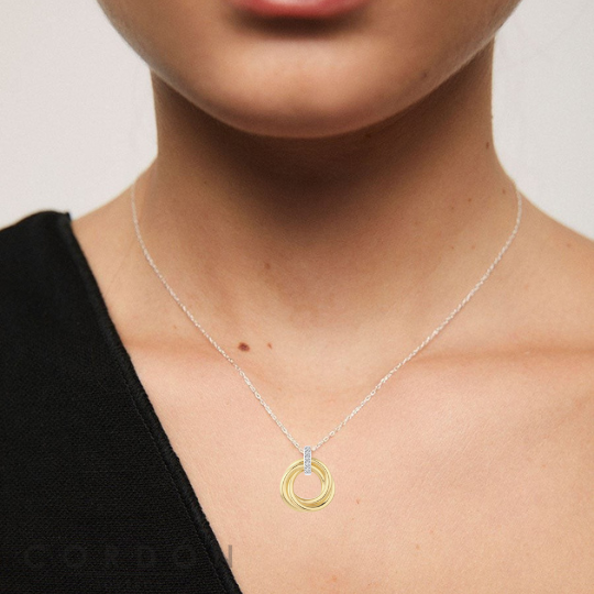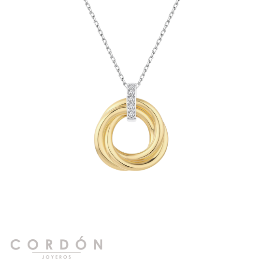 Collar de Cordón Joyeros para mujer de la Colección ETERNAL bicolor, fabricado en plata 925 bañada en Oro Amarillo compuesta por un Nudo entrelazado entre si y con Circonitas Blancas en la asa. Su cierre es de mosquetón. La gargantilla ETERNAL NUDO CIRCONITAS, combina diferentes formas. La alta calidad de las piedras la inunda de brillo y elegancia. Combínala con los pendientes a juego o con los anillos.
