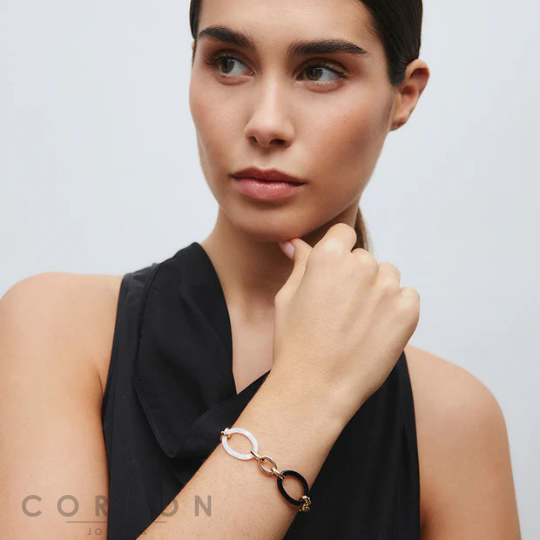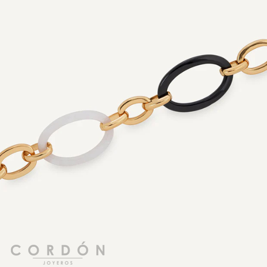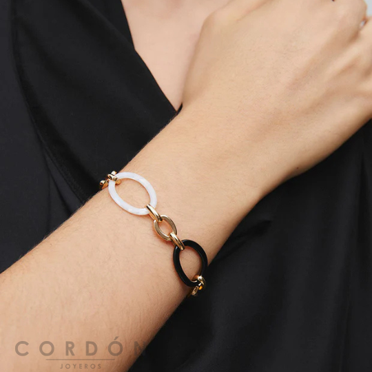 Te presentamos la Pulsera X9817517 Foclar, bañada con una gruesa capa de oro macizo de 18 kt, lo que garantiza una mayor durabilidad. Destaca por sus piedras de acetato y resina en tono negro, que aportan un aire de sofisticación en clave neutra.