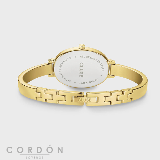 Te presentamos el Reloj ovalado de la casa Cluse modelo CW16103 L’Ovale, cuenta con una caja dorada de 22 mm, una esfera verde oliva de acabado sunray y una correa de acero inoxidable dorada de 6 mm.