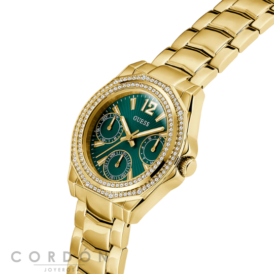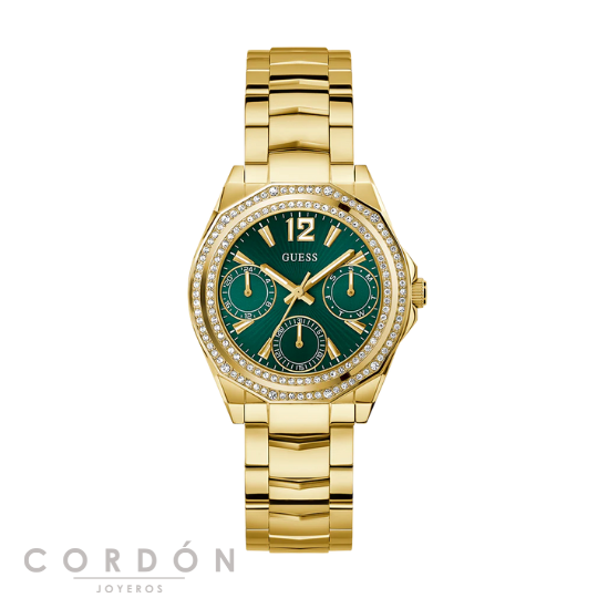 Esfera de iridiscente verde multifunción y brazalete de acero brillante dorado. Luce el máximo glamour con este diseño tipo pulsera, que destaca por su bisel con doble fila de cristales y estilo sofisticado.