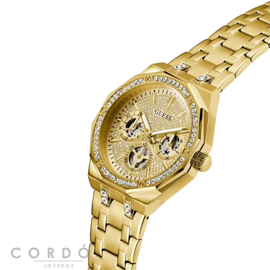 Reloj de hombre Guess con caja de acero reciclado brillante dorada de 42mm con cristales blancos, esfera multifunción de iridiscente con polvo brillante de cristales blancos y pulsera de acero brillante dorada con eslabones de cristales blancos. Lleva el brillo al siguiente nivel con este reloj impactante, lleno de cristales y actitud poderosa.
