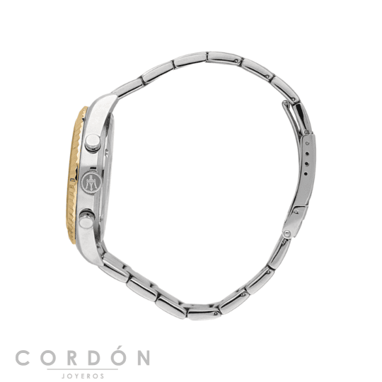 El reloj cuenta con una caja de acero inoxidable de 43mm de diámetro y un elegante bisel texturizado en tono dorado que enmarca la esfera. La esfera blanca está adornada con detalles en tono dorado y tres subesferas que incluyen funciones de visualización de la fecha y del día de la semana.