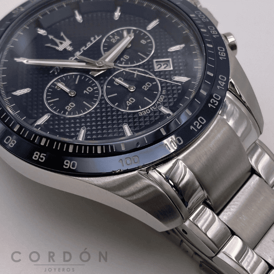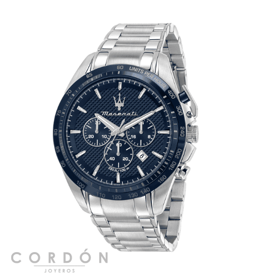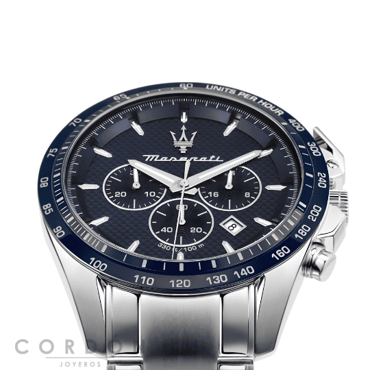 El reloj cuenta con una caja de acero inoxidable de 45mm de diámetro y con la esfera azul combinada con caja y pulsera en acero. El reloj viene con un brazalete de acero, con hebilla desplegable, con una caja redonda de 45 mm que se combina con una esfera azul y un cristal mineral resistente. Resistencia al agua hasta 10 ATM. Las colecciones de relojes Maserati se caracterizan por su diseño sofisticado, sus elaboradas construcciones y sus detalles personalizados.