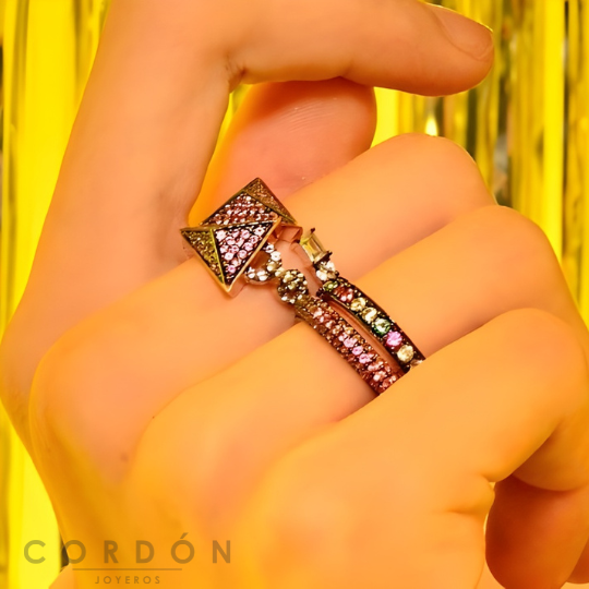 Un cuidado micropavé de circonitas en distintas tonalidades le da luz y color a estas maravillosas piezas.