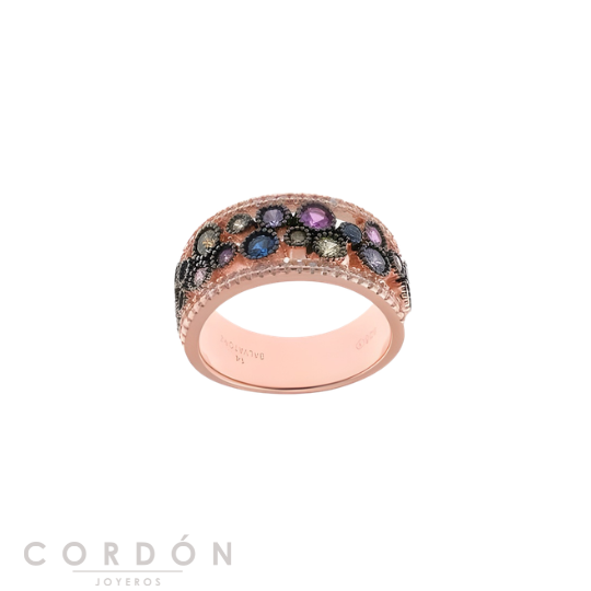La Sortija Plata Chapado Rosa Baguet Lavanda Y Chapado Rutenio Gallonadas De La Colección Vibrant de la casa Salvatore le dará un toque de color que iluminará tu look y tu rostro.