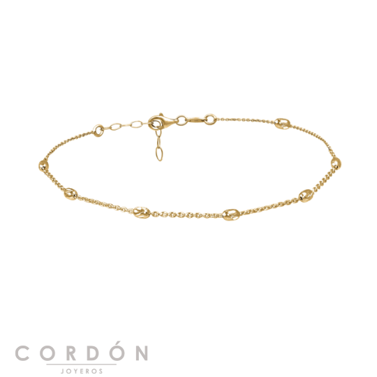 Tobillera de Cordón Joyeros Dorada Bolas, fabricado en plata 925 bañada en Oro 18K. Presenta un diseño de una cadena con motivos en forma de Bolas. Su medida es de 24+4cm.